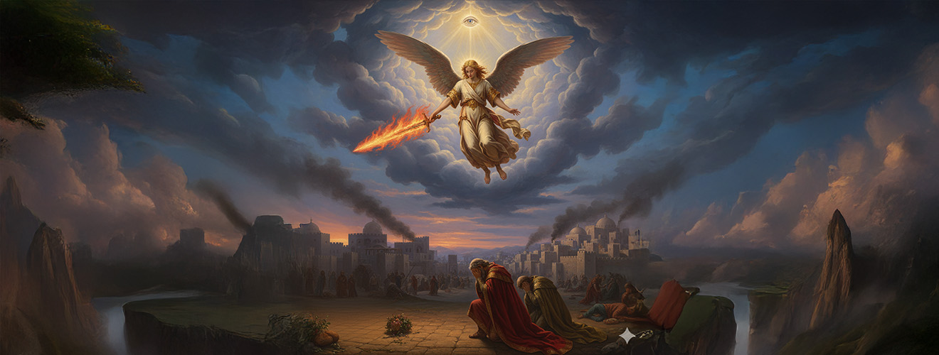Alternatively, we can highlight God’s absolute and uncontested power, working in conjunction with his angel. God unleashed a plague, resulting in the death of 70,000 men, seemingly as a consequence of David’s reliance on the size of his army. Subsequently, God’s angel would be sent forth, sword drawn and prepared, to commence a wave of destruction across Jerusalem. The angel’s destructive capability would be so immense that even God, upon witnessing its efficiency in executing his commands, would be moved to compassion and instruct the angel to cease its actions.