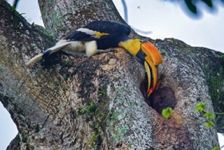 When the female is ready to lay her eggs, she and her mate begin to seal the nest cavity’s entrance with her inside. They construct a wall using mud, droppings, and fruit pulp, which, while providing security, can be likened to a prison. She leaves only a narrow slit, just wide enough for her mate to pass food through, making her entirely dependent on him for sustenance. During this time, she will often pluck out her own flight feathers, as they are unnecessary while she is raising her young inside the sealed nest.